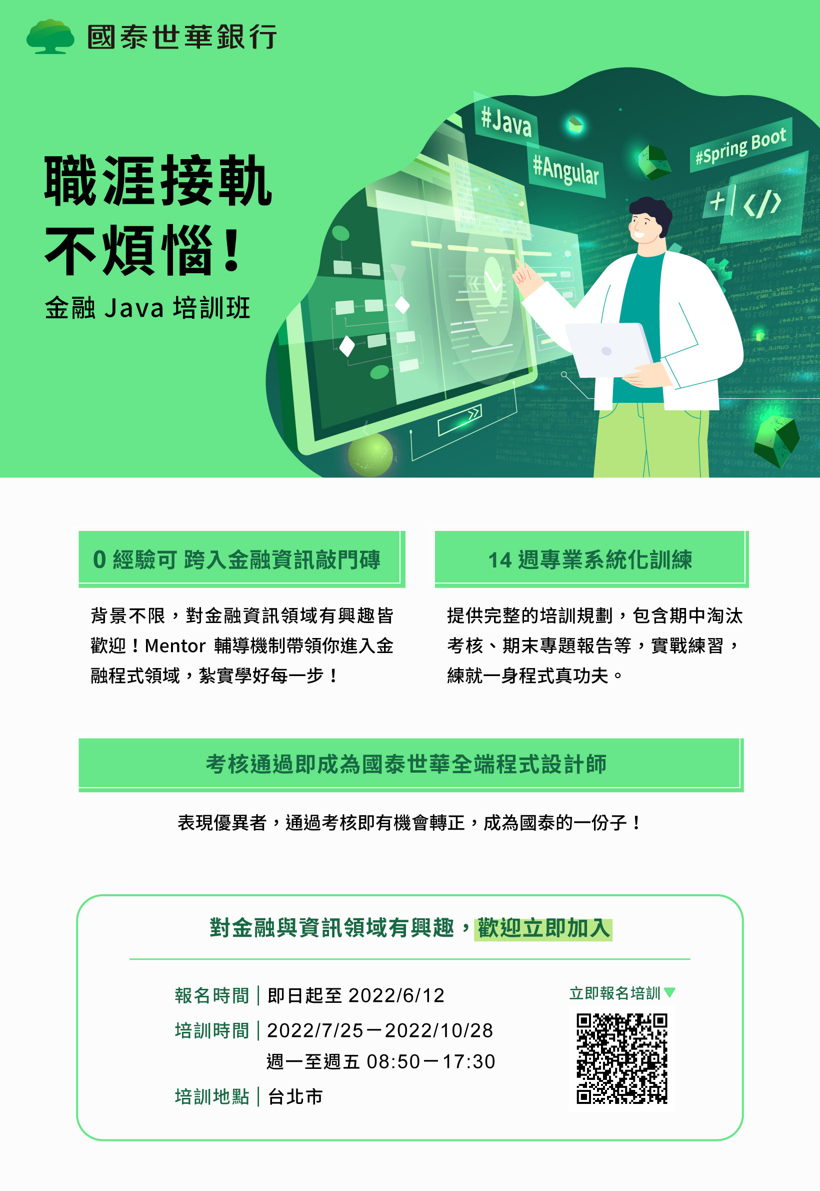 報名方式 : 請至國泰人才招募網站投遞【資訊培訓班】金融Java培訓班 職缺 :