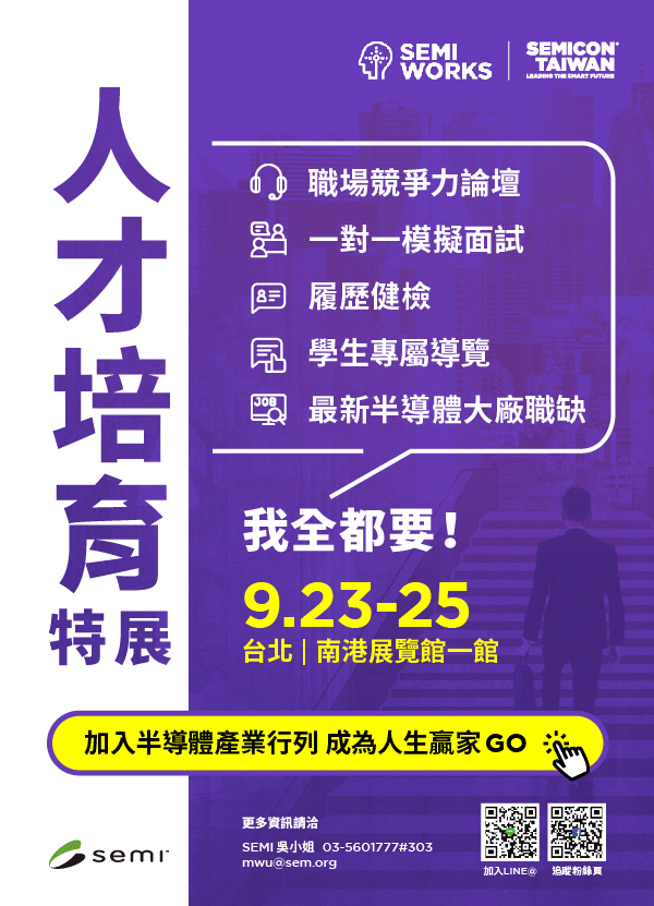 時間:9月23日~25日 地點:南港展覽館 特展網站:http://www.semicontaiwan.org/zh/smart-workforce-pavilion