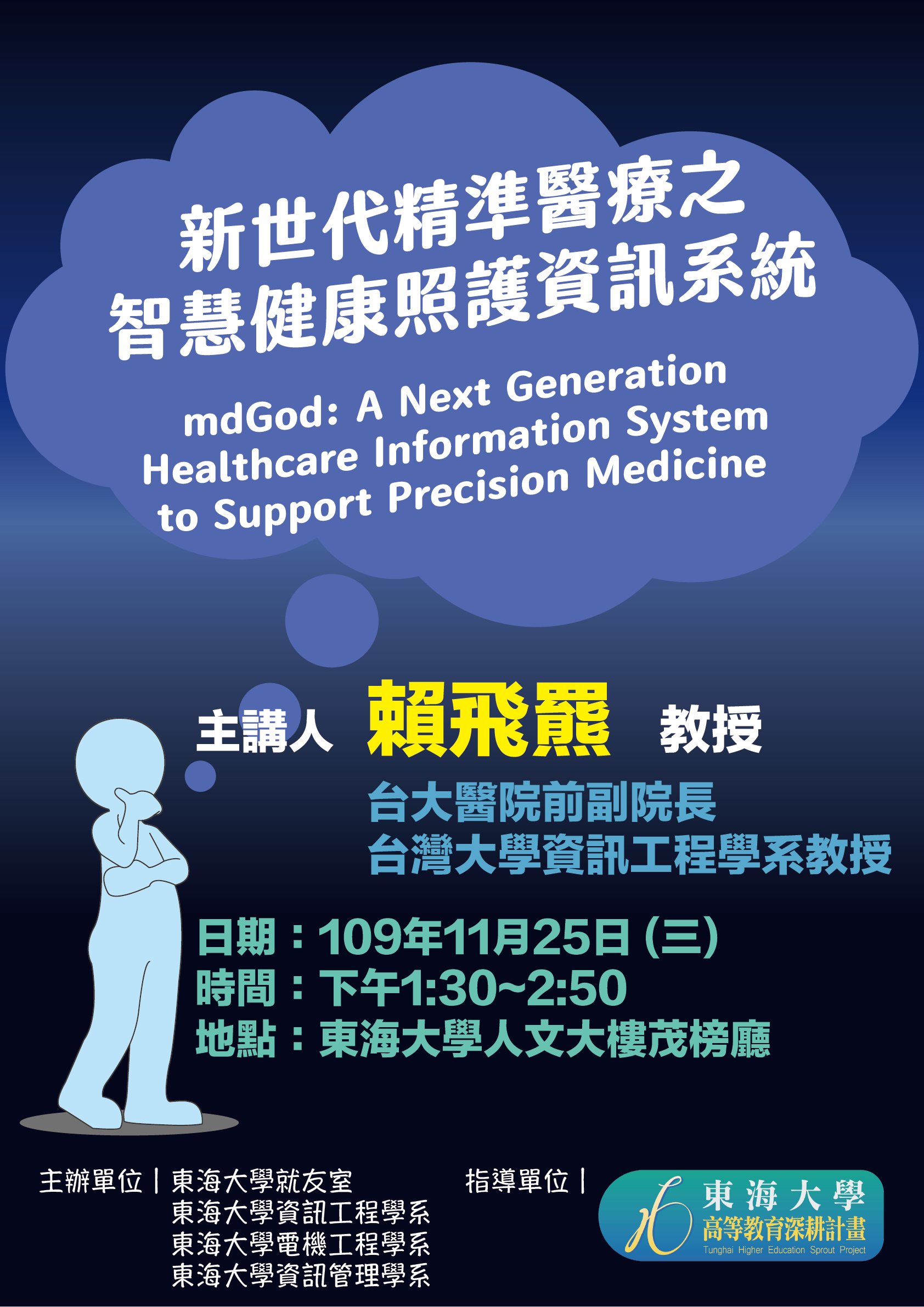 主講人:賴飛羆教授(台灣大學資訊工程學系) 講 題:mdGod: A Next Generation Healthcare Information System to Support Precision Medicine