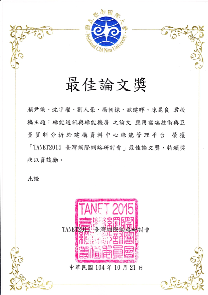 恭喜本系楊朝棟老師指導之研究生 顏尹臻、沈宇權、劉人豪及電算中心同仁 歐建暉、陳昆良投稿之論文「應用雲端技術與巨量資料分析於建構資料中心綠能管理平台」,榮獲TANET2015臺灣網際網路研討會最佳論文獎!