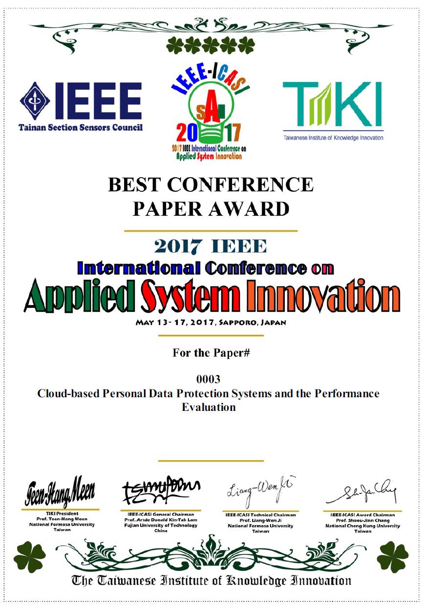 恭喜!本系李耕瑜同學論文榮獲ICASI 2017 BEST CONFERENCE PAPER AWARD。