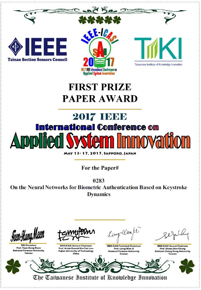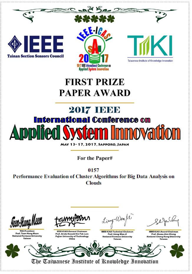恭喜本系研究生 李耕瑜同學、林志原同學、彭倧輢同學榮獲 ICASI 2017BEST CONFERENCE PAPER AWARD及ICASI 2017 FIRST PRIZE PAPER AWARD