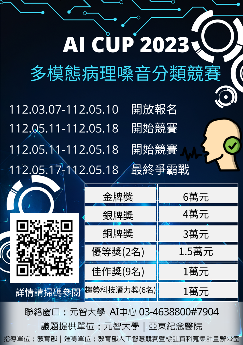 本競賽為全台第一個病理嗓音分類AI競賽,具有獨特性及創新性,期望能藉由此競賽吸引更多人才投入AI研究,促進本國科研發展與數位前端人才培育。