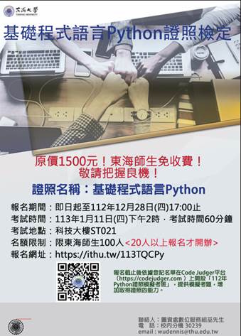 3. 為提高考取證照機率,圖資處於報名截止後依據登記者名單在Code Judger平台(https://codejudger.com )上開設「112年Python證照模擬考班」,請已登記的師長與同學屆時以THU-NID@thu.edu.tw帳號登入到Code Judger平台的Python模擬考班練習。