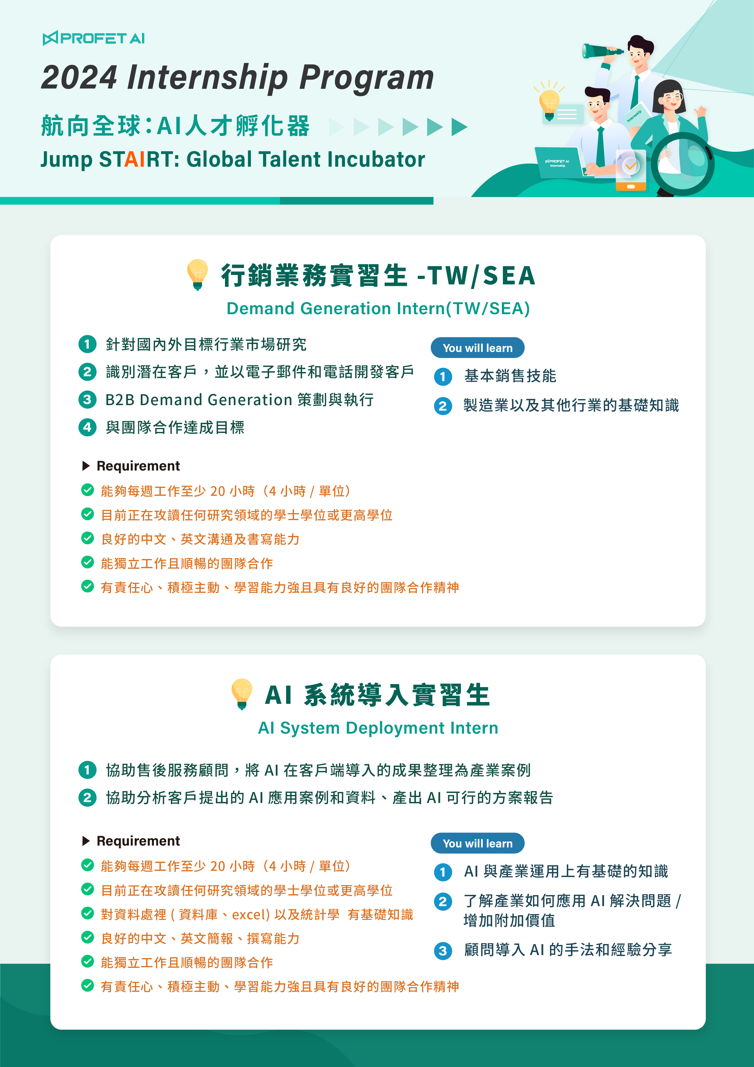 經歷了AI元年,全球各界人工智能應用大爆發,你準備好迎接這AI世代了嗎?Profet AI 杰倫智能邀請各位對於AI充滿好奇、抱懷展望的莘莘學子,透過我們為期六個月的實習計畫一探究竟產業AI應用。以人為本,透過賦予人使用AI的能力,達成人才升級,以面向全球市場的挑戰。