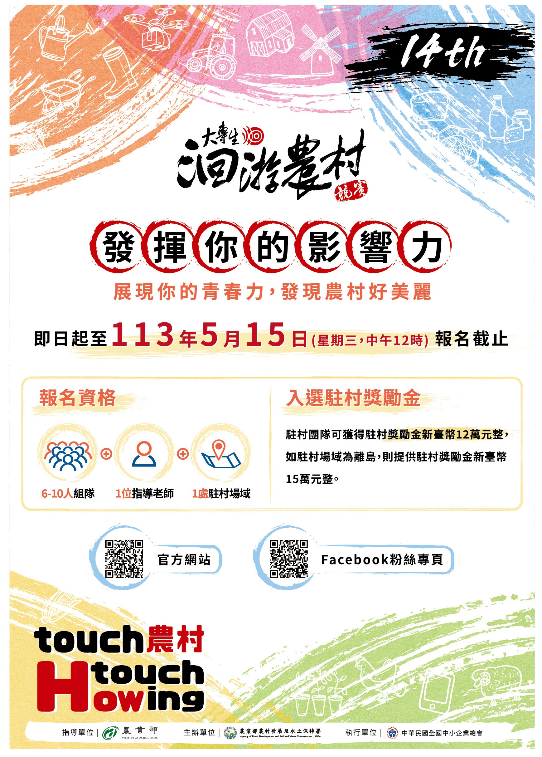 1.為引動大專青年參與農村,農業部農村發展及水土保持署特辦理「第十四屆(113)大專生洄游農村競賽」,提供大專青年進駐農村學習及發揮創意的最佳機會,敬請協助公告轉發貴系()學生參加,感激不盡!