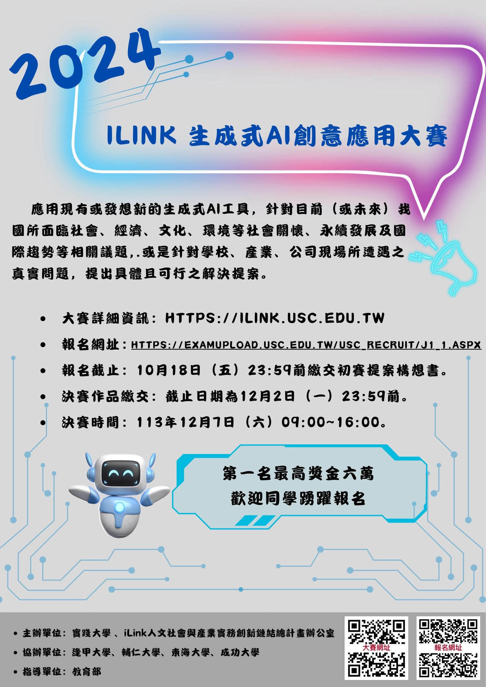 五、競賽相關訊息請至競賽網站查詢,網址為https://ilink. usc.edu.tw/,或洽活動聯絡人季小姐,電話:(02)2538- 1111分機1768。