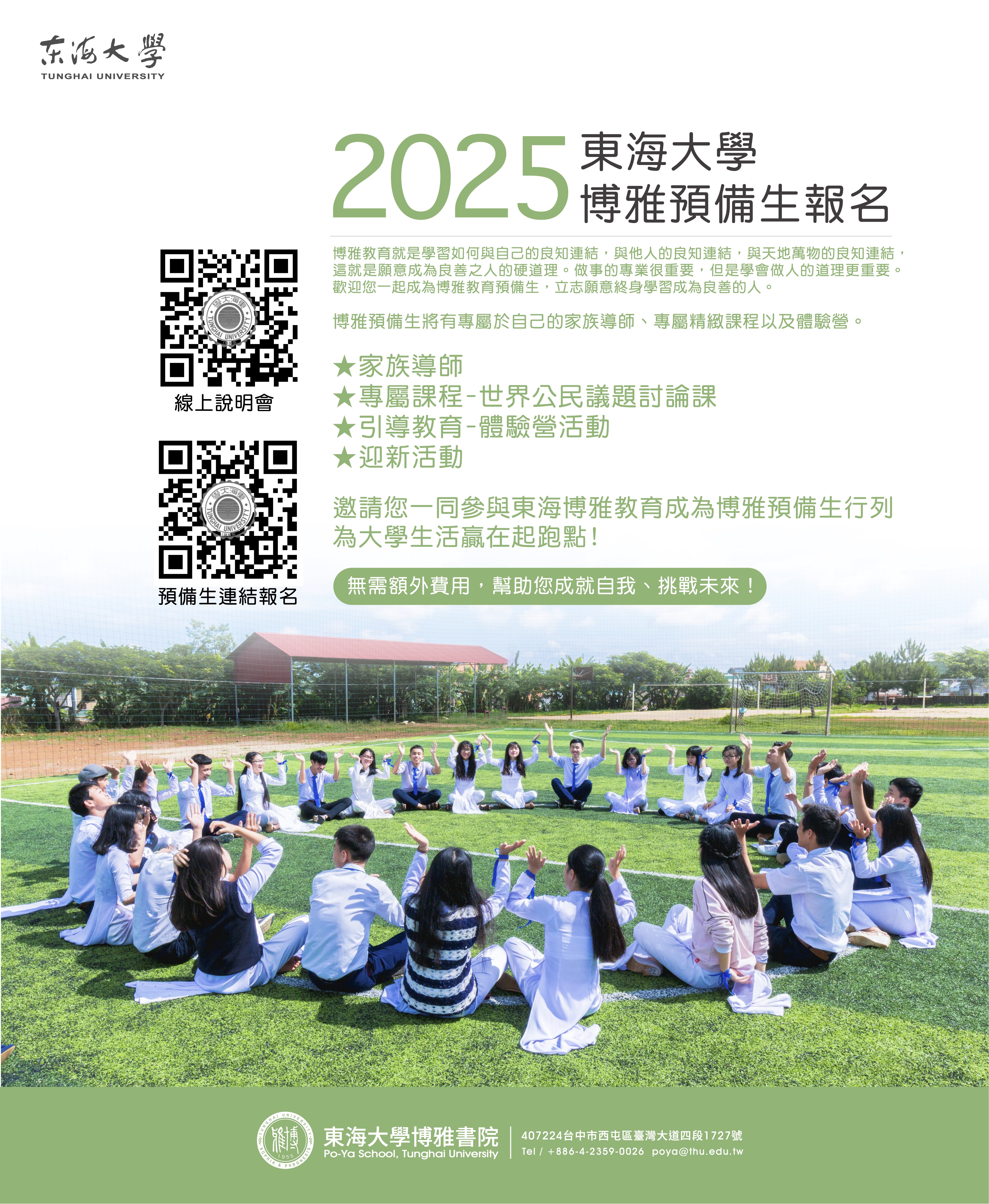 附件檔案: 114學年東海大學博雅書院預備生招生海報.jpg 下一則:「2025國際安全智造研討會」 上一則:【2025總統盃黑客國際松|提案熱烈募集中!】 回列表