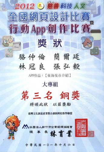 恭賀本系朱延平教授指導的駱仲倫、簡爾廷、林冠良、張弘毅四位同學,在2012全國慈善.科技.人文全國網頁設計比賽暨行動App創作比賽中,以APP作品:「東海夜市介紹」榮獲大專組第三名銅獎!