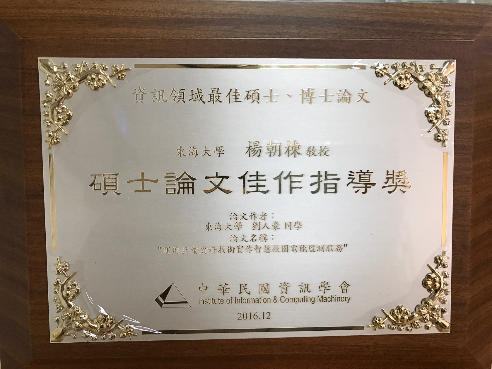2016年7月甫自本校資工系碩士班畢業的劉人豪同學,經指導老師楊朝棟教授強力推薦,參加中華民國資訊學會(IICM)主辦之105年碩博士最佳論文獎之遴選,由於研究表現優異,榮獲「佳作」,並獲頒發獎狀乙幀及獎牌。中華民國資訊學會於2017年3月11日在台灣大學(德田館)舉辦中華民國資訊學會碩博士論文獎頒獎典禮,由中華民國資訊學會理事長張瑞雄教授頒發獎項予劉人豪同學。中華民國資訊學會自1999年設立「資訊學會碩博士最佳論文獎」。值得一提的是,今年此獎僅有兩所私立大學同學獲頒此殊榮,實屬難得。
