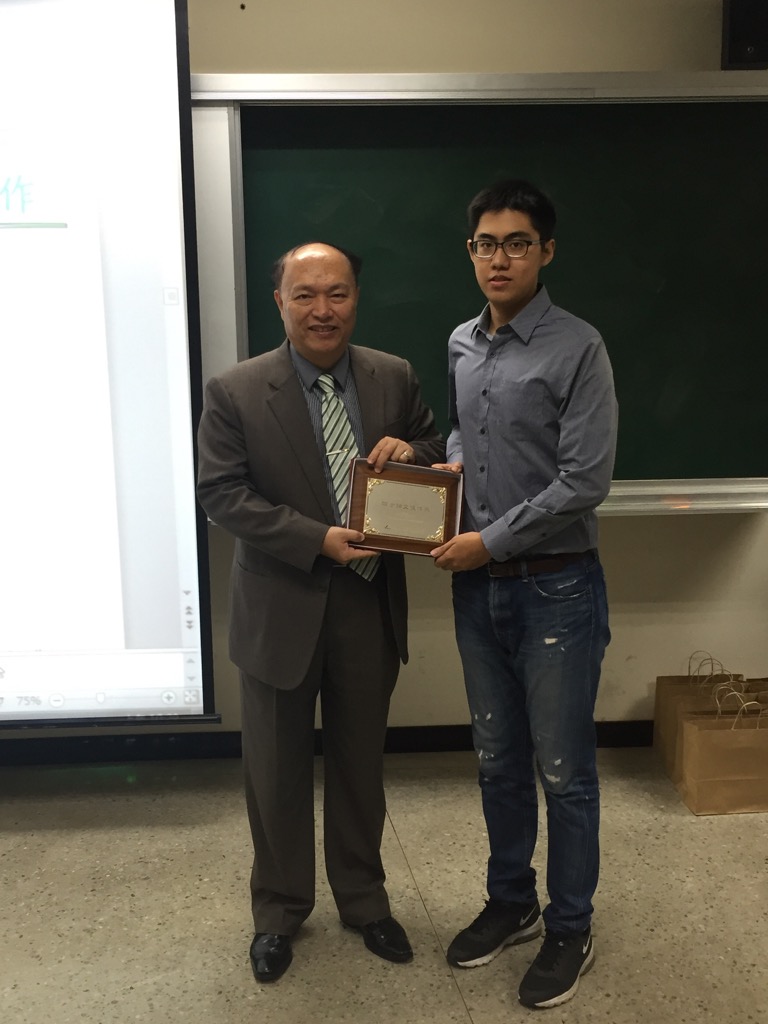 劉人豪碩士接受中華民國資訊學會理事長張瑞雄教授之頒獎與祝賀
