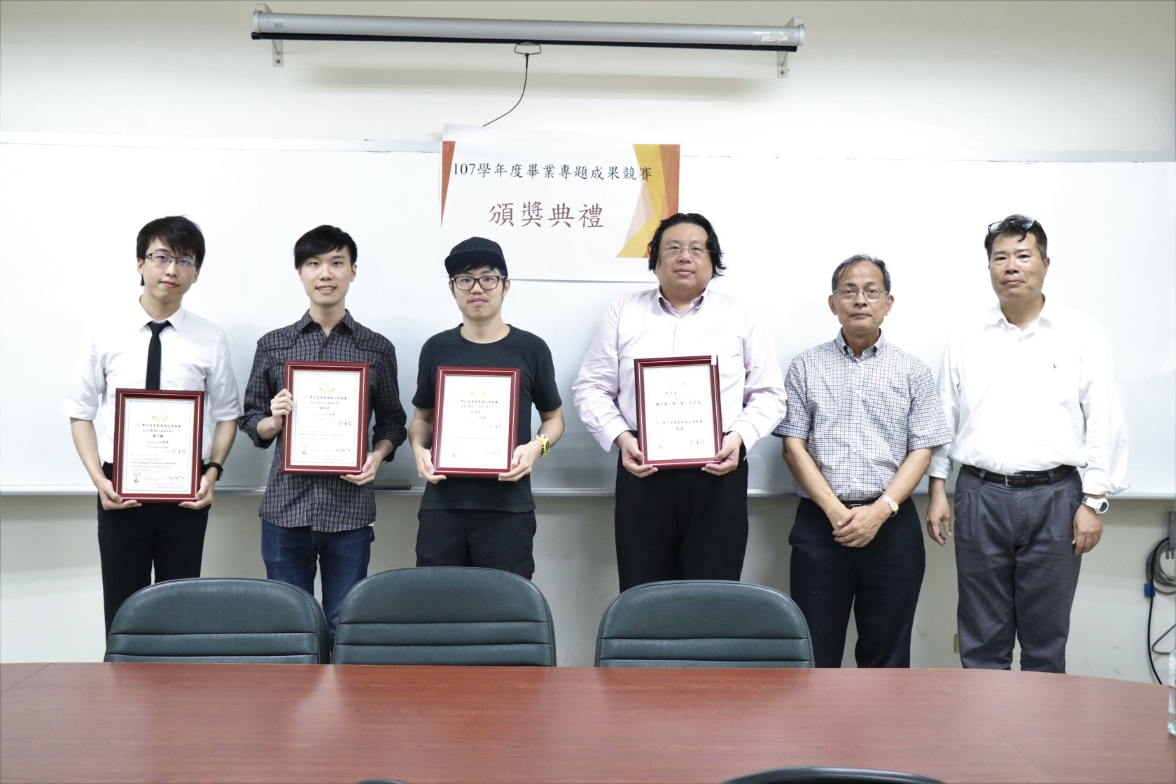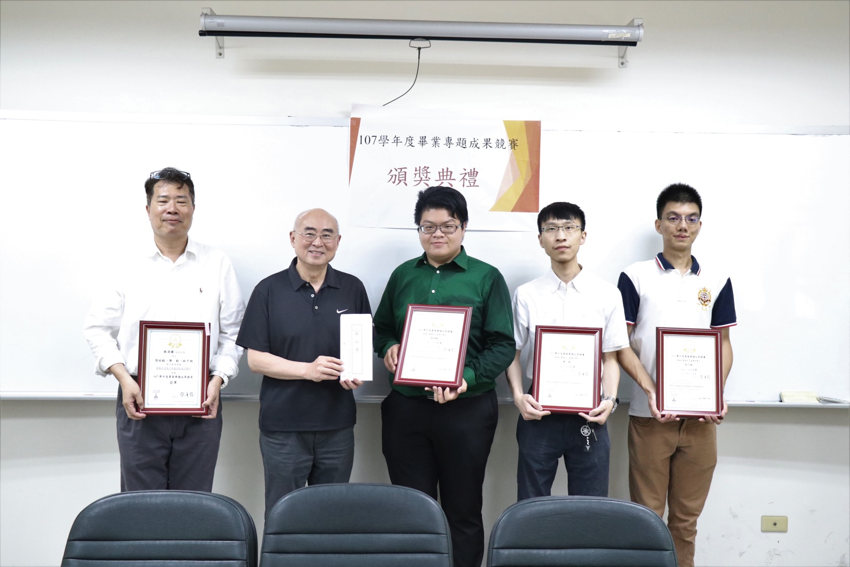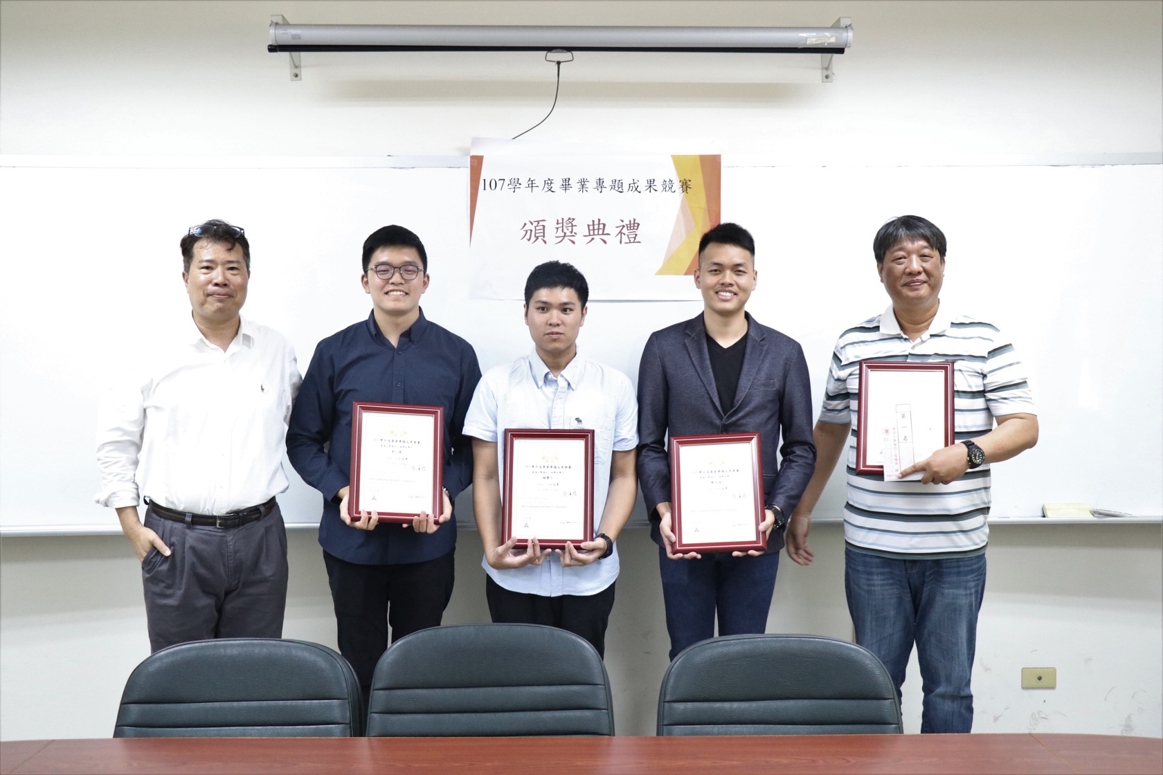 第一名:李沁築、謝兆倫、賴聲平三位同學,黃育仁教授所指導,以「智慧型光學鑰匙」榮獲佳績,評審評語:極具創意,實作成品質感佳,報告呈現完整且精彩,有高度應用價值,應申請專利。榮獲獎金三萬元整。