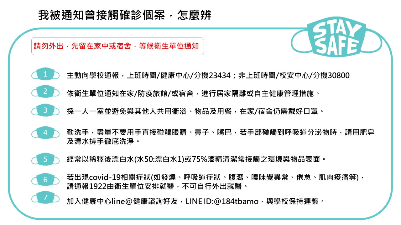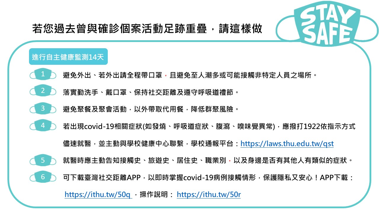 若您對目前校園的防疫新措施還不清楚,或是您曾與確診個案的足跡重疊,應該怎麼做好自我防護呢?!