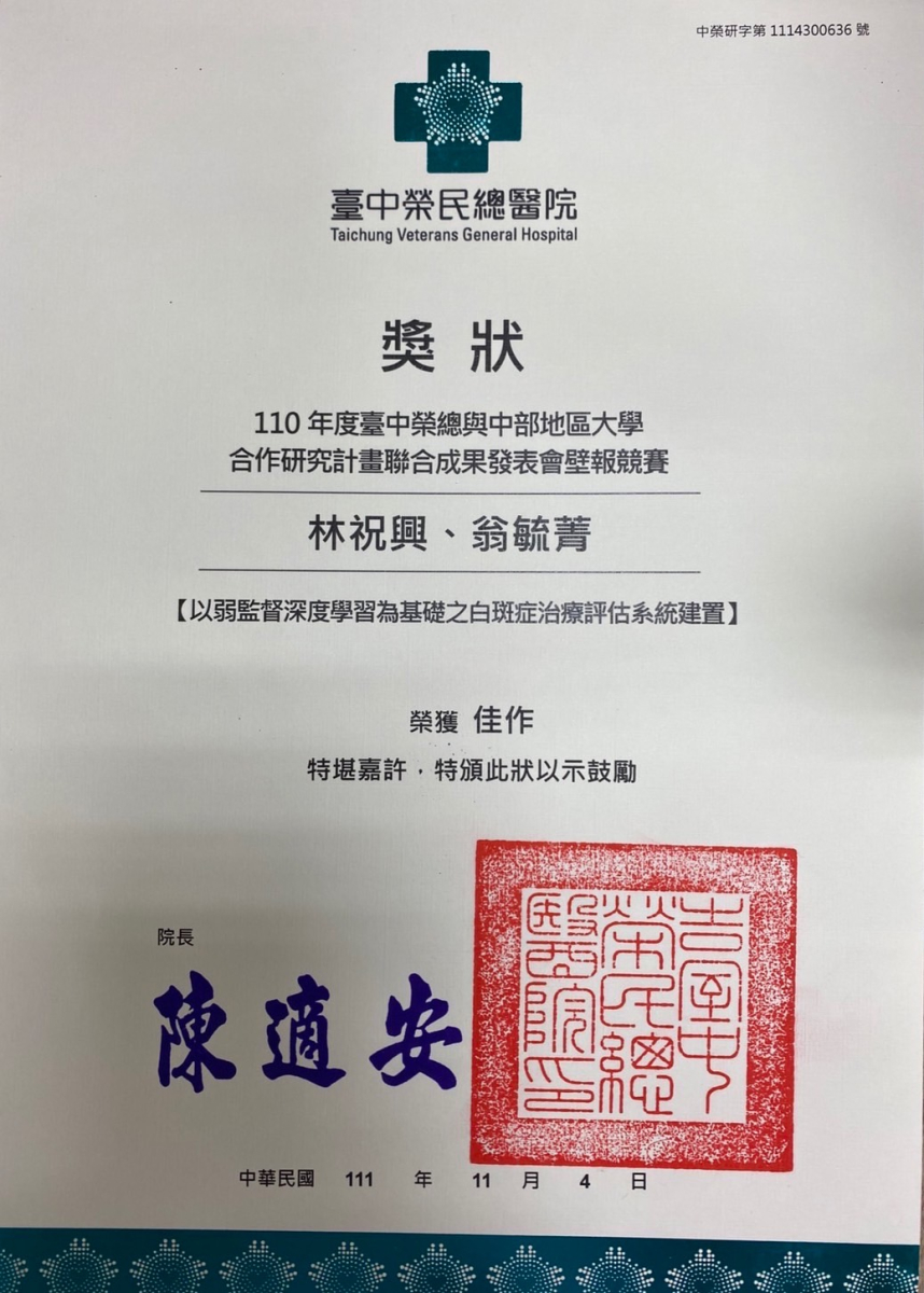賀!本系師生榮獲110年台中榮總與中部地區大學合作研究計畫聯合成果發表會壁報競賽佳作 計畫主持人:林祝興教授、翁毓菁醫師、石志雄教授 參與學生:簡振宇 研究題目:以弱監督深度學習為基礎之白斑症治療評估系統建置