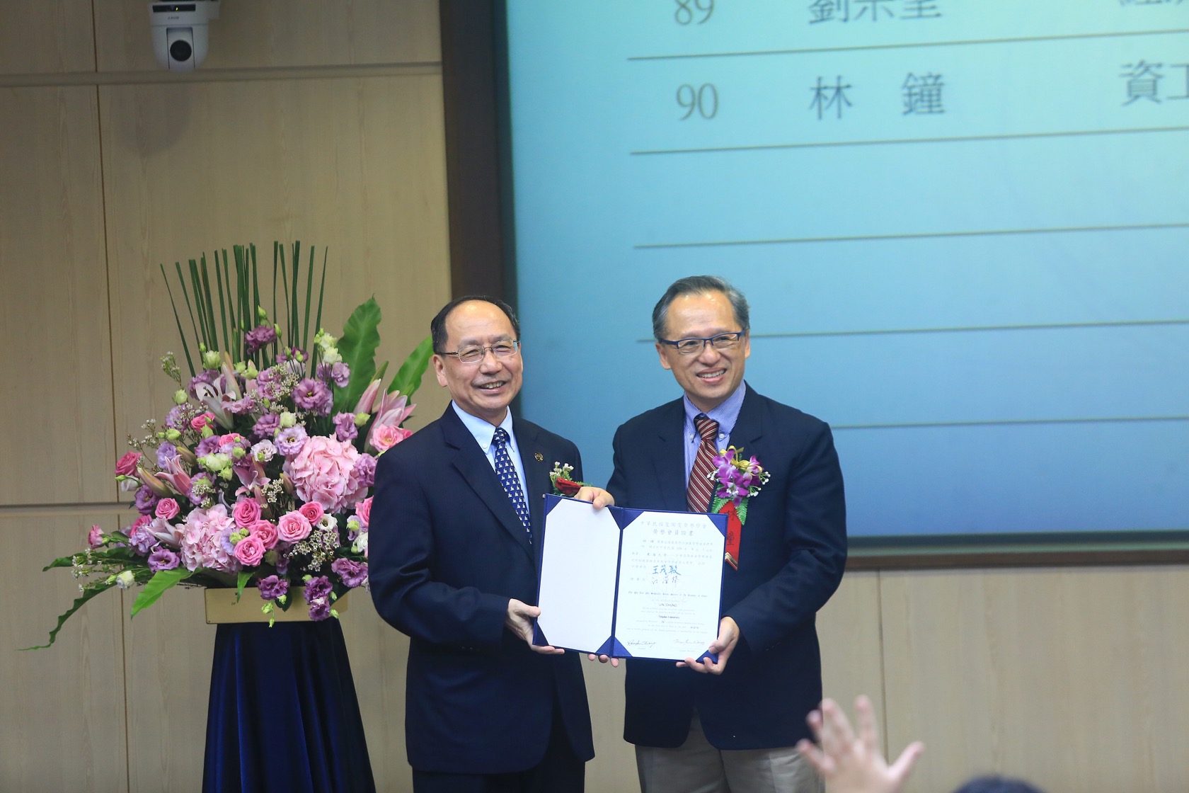 會中王茂駿校長於典禮上介紹林鐘系友,主要職涯發展都是在高科技領域,在職場上有著傑出的表現,值得成為模範,並邀請林鐘系友上台致詞。林鐘先生於致謝詞中表示,他出生台中,家住在台中大肚山下的沙鹿小鎮,高中就讀台中一中,他每天上下學都會經過東海大學,後來就讀於東海大學,與東海的緣分可以說是非常深。他沒想到Computer Science電腦現今會這麼夯,東海四年教育給予他最大收穫是把一個內向只會唸書的學子教育成一個懂得念書方法,學會專業與人溝通、合作。即使到畢業超過三十年,現在他還是保持經常閱讀、持續精進。他鼓勵學弟妹所謂的專業並不是你會什麼,而是你能持續學習新知。他回憶從美國求學回來後進入HP工作十年,IT是當時最好的產業,但後來他踏入半導體領域,因為有個內心聲音出現告訴自己”你應該往最新的去”,於是他進入半導體領域,加入日月光半導體集團,他舉家到上海至今已經十五年,在哪裡他遇到很多台商、外商、全球國際客戶,他認為年輕學子需要具備勇敢往外、國際移動與冒險精神,在座得獎各位的成績都是最優秀,已經打下好的基礎,可是這還不夠,你要認知後往前衝,把握機會往前衝!在職場上每當他遇到困難時,內心的聲音就會出現,那是母校校訓「求真、篤信、力行」,當時在校念書時懵懵懂懂並不能體會校訓的意義,直到工作大概快二十年時才體會「求真」就是「慎思明辨」,現在科技進步,他隨時提醒自己明辨思想,在職涯幫助了自己很多,培養認知該做的事情就多做一點、不該做的事情不能做,好習慣就去養成它、壞習慣就要去掉它,讓自己成為更好的人。之後朝著「篤信」、「力行」,持續地朝正確方向努力。林鐘學長深刻的體會在他工作與生活困難的時候校訓幫助他,他以東海為榮,這些種子也埋在各位的心中,也許對於未來不論是升學還是就業還有著困擾,就和我們當初一樣,但他相信各位一定會表現得更好,因為機會在等著肯冒險的年輕人,克服困難往前行!最後祝福大家在之後的人生,你們會做得更好,也很高興很榮幸今天能回到學校來分享,並會再繼續做下去!