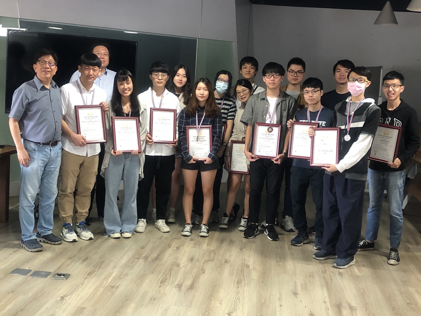 系主任林祝興教授、評審教師焦信達助理教授與全體獲獎同學們合影