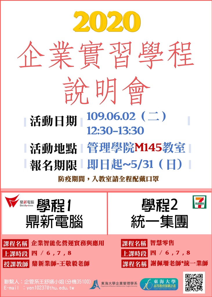 一、目的:企管系109(1)有2門課程是以課程+實習方式授課,為把資訊帶給各系各大三(升大四)生,故召開本說明會。