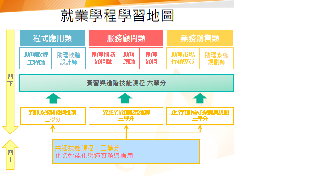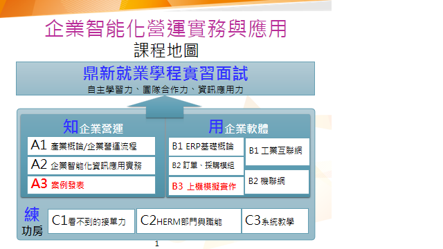 - 大四上在學校開一門3學分課程-企業智能化營運實務與應用,建立企業實務基礎專業知識。