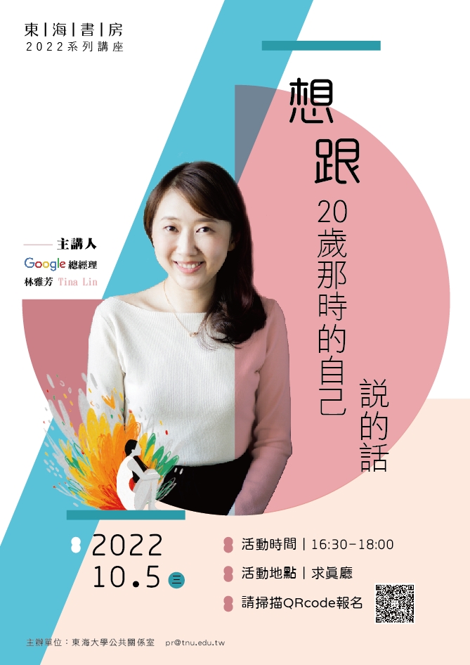 日期:111年10月5日 星期三 時間:16:30-18:00 (16:10 開放入場) 地點:東海大學 求真廳 講者:林雅芳 女士 演講主題:想跟20歲那時的自己說的話 活動短網址:https://event.ithu.tw/2022090073 備註:本演講可計入專題演講次數,請現場聆聽同學確實辦理簽到。