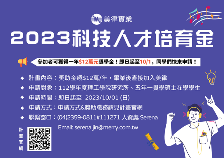美律2023年獎學金計畫【科技人才培育金】申請開跑囉!歡迎貴校系理工學院碩班同學報名申請!