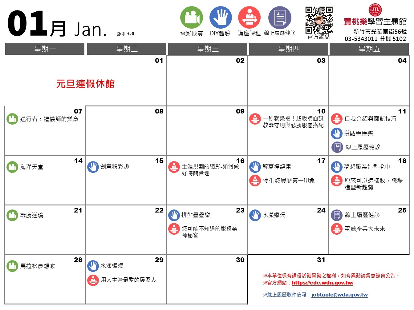 勞動部勞動力發展署桃竹苗分署【賈桃樂學習主題館】─1月份行事曆