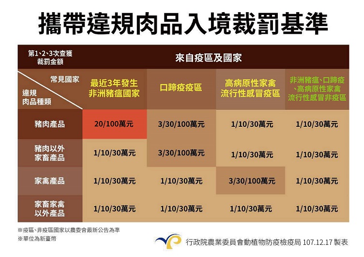 二、依據動物傳染病防治條例第45之1條規定及行政院農業委員 會107年12月18日公告的裁罰基準(如附件),入境旅客自疫 情國家違規攜帶豬肉產品入境遭查獲,第1次違規將裁罰20 萬元,第2次開罰100萬元;外來人士遭罰20萬元未能繳清 罰款者移送內政部移民署當場拒絕其入境。