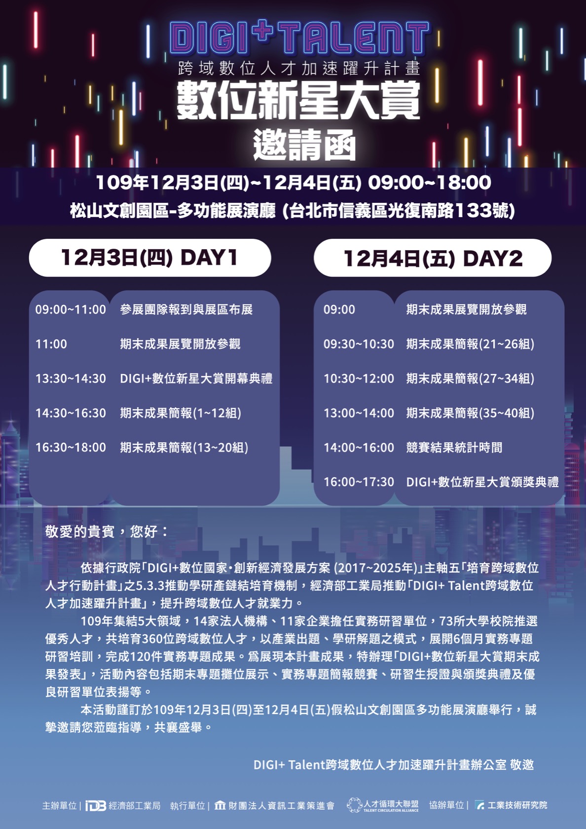 三、本活動謹訂於12月3日(四)至12月4日(五)假松山文創園區 多功能展演廳舉行,敬邀各校師長蒞臨指導,共襄盛舉, 報名網址:https://www.accupass.com/go/digitalent