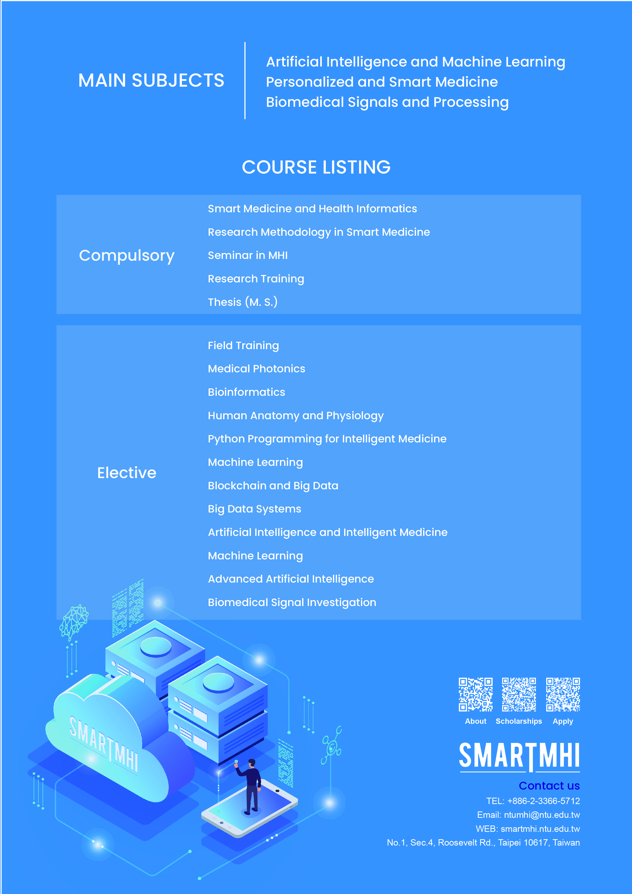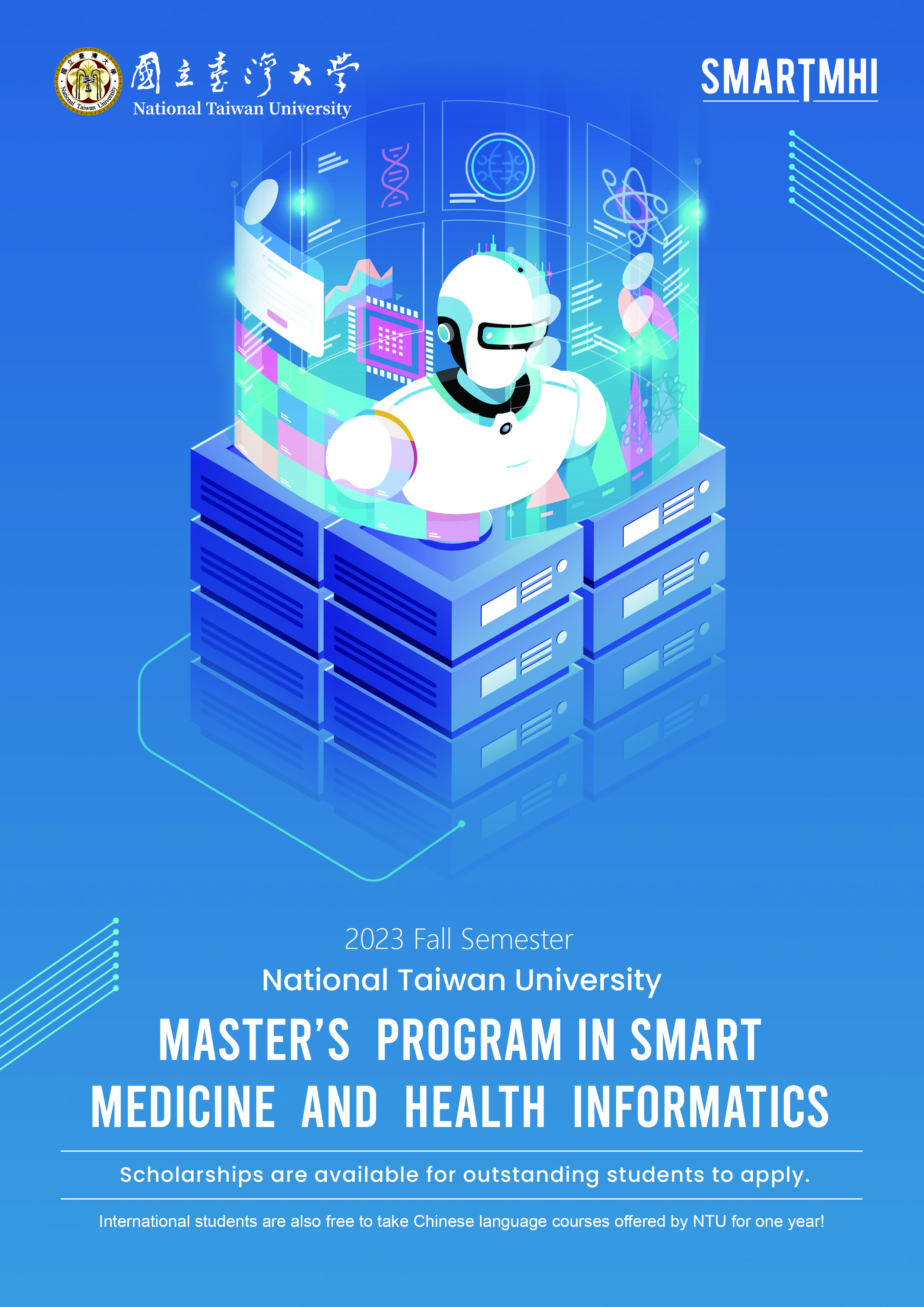 臺大全英語授課的跨領域「智慧醫療與健康資訊碩士學位學程」(Master’s Program in Smart Medicine and Health Informatics) 旨在培育引領醫療產業數位智能化 AI 之轉型與領導人才,課程規劃涵蓋「個人智慧化醫療」、「人工智慧與機器學習」、「生醫數位訊號及處理」等主軸,跨領域融合資通訊工程與生醫衛健康面向,並提供學生場域實作機會。此學程招收本地生、國際生與僑生。