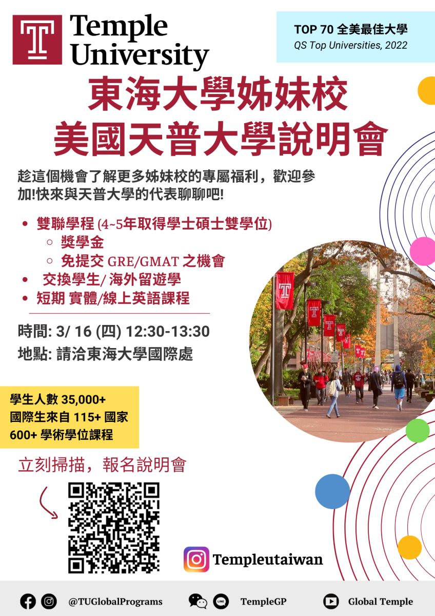 國際處與姊妹校美國天普大學聯合舉辦3+2雙聯學程說明會,說明會將於3月16日(星期四)中午12點30分至13點30分舉行,活動場地待報名後將會另行通知參加同學,歡迎有興趣的同學可報名參與,活動海報請參閱附件,如有任何疑問,煩請不吝聯繫國際處。