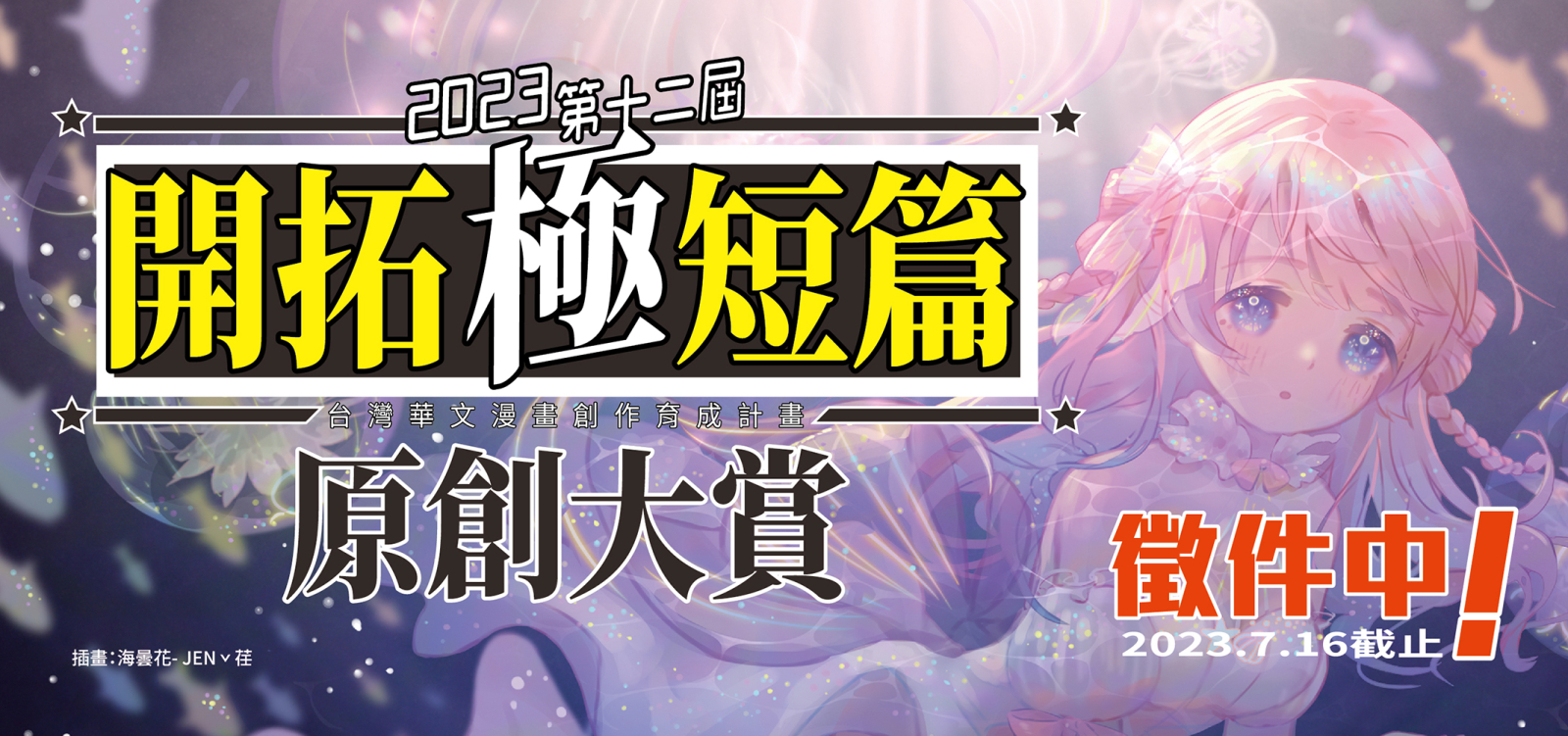 秉持推廣優秀原創人才、協助創作者們開創未來的願景,今年2023年第十二屆「開拓極短篇原創大賞」已開始徵稿,自即日起至07月16日截止。