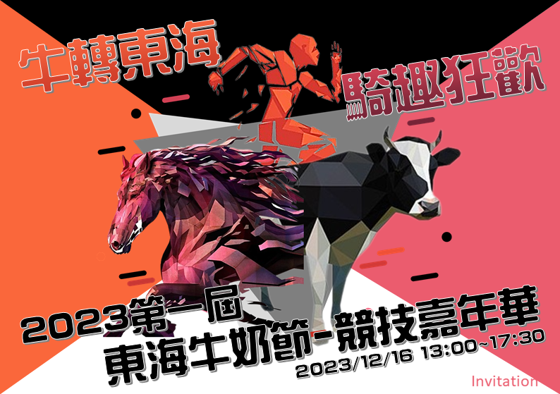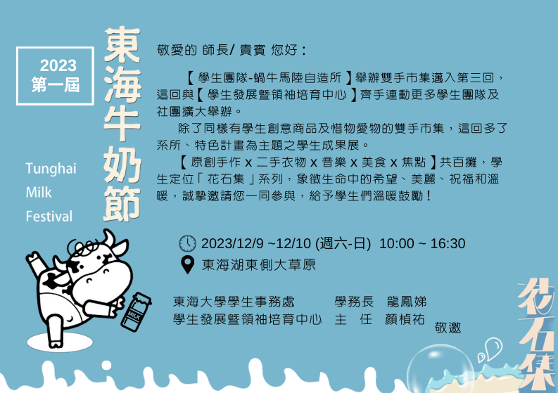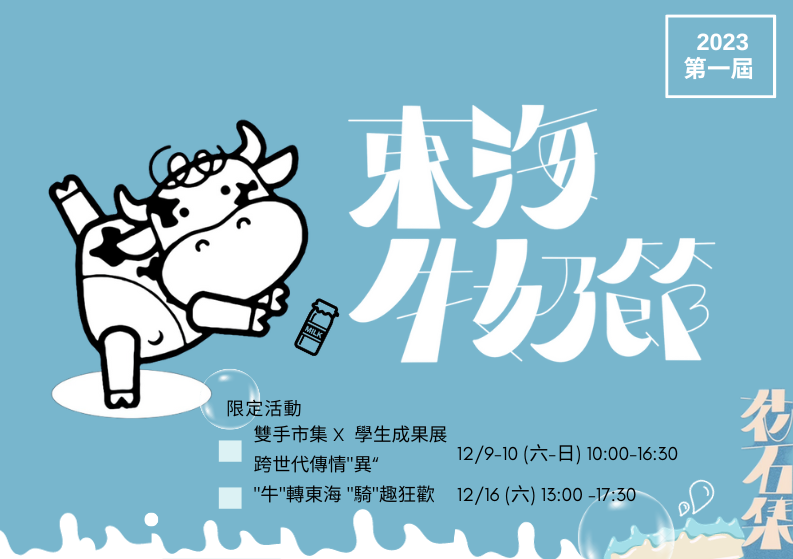【雙手市集 x. 學生成果展】於12月9-10日 (週六-日) 10:00-16:30 100%學生策劃進駐設攤共百攤,品項豐富。 【"牛"轉東海 "騎"趣狂歡】於 12月16日(週六) 13:00-17:30 混齡共學共玩,歡迎相約報名趣: https://event.ithu.tw/2023100057 東海牛奶節系列活動於< 東海湖東側草原> 舉辦, 竭誠邀請師長、貴賓與學生、家人、朋友齊趣歡樂!