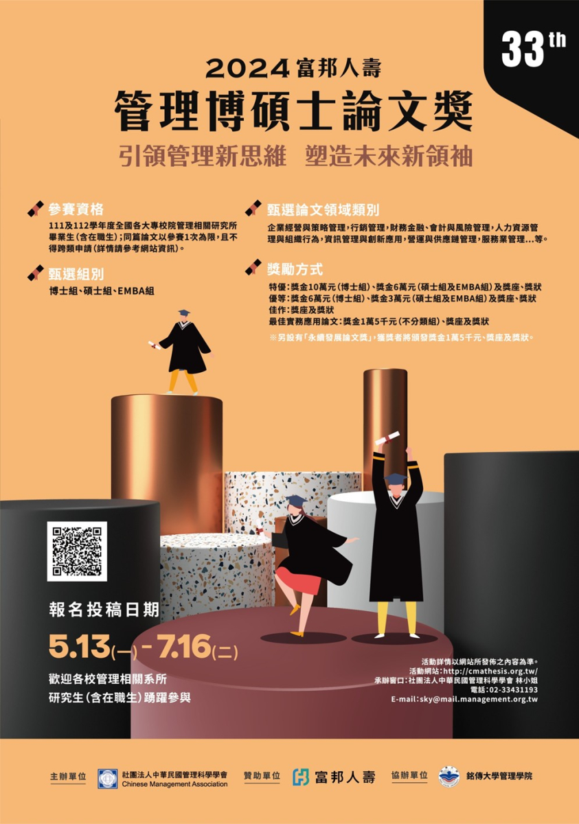 「富邦人壽管理博碩士論文獎」(以下簡稱本活動),使本活動得以穩定成長,迄今已邁入第三十三年!