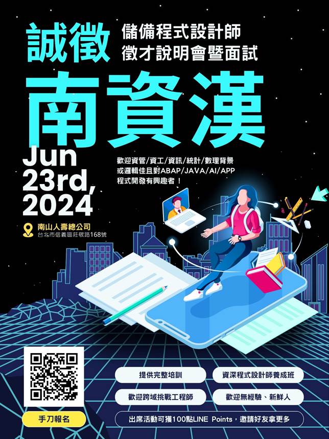 6/23(日)上午南山人壽儲備程式設計師培訓專案說明會暨面試。