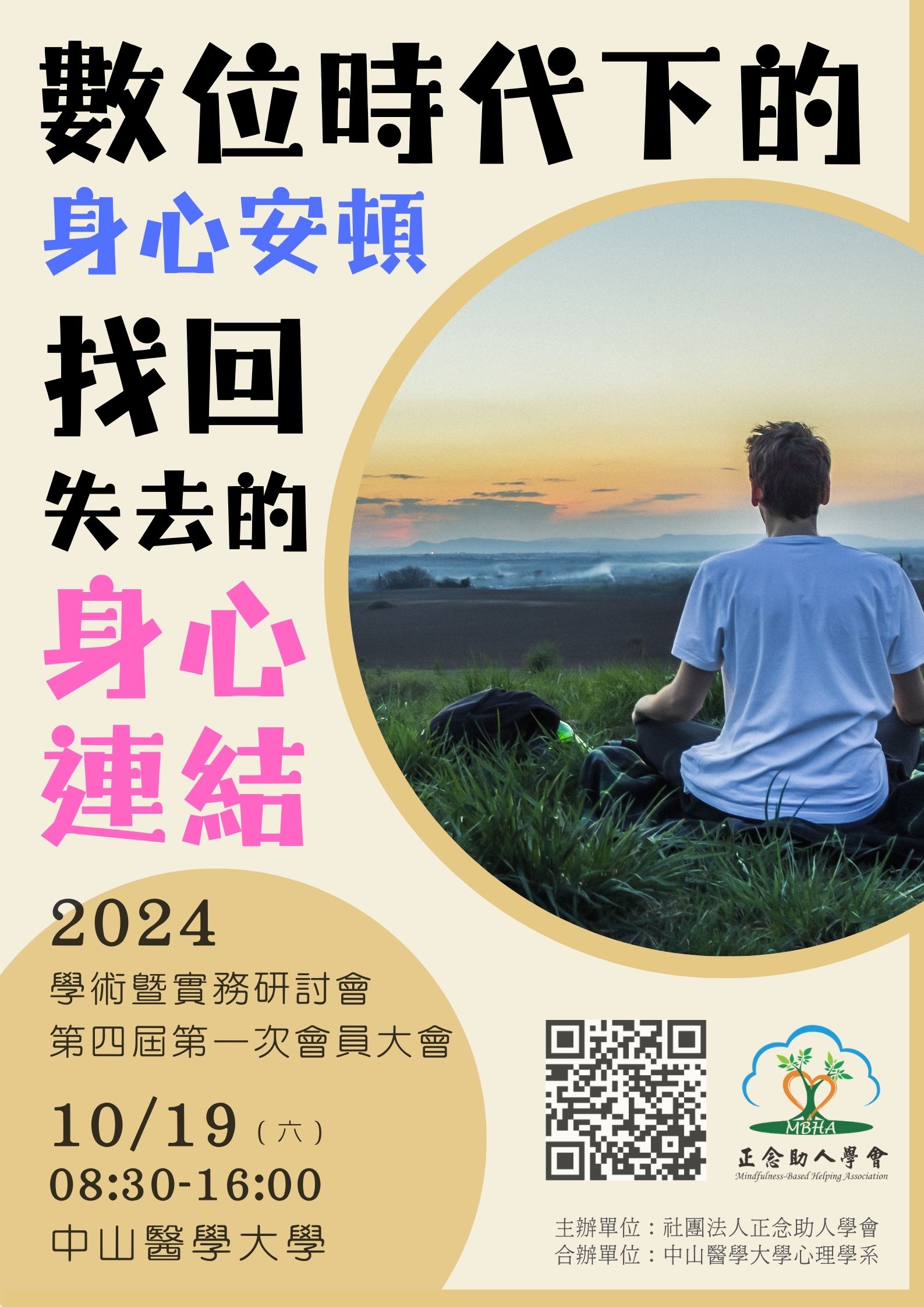 今年本會於10月19日星期六,假中山醫學大學,將辦理【2024數位時代下的身心安頓:找回失去的身心連結】 學術暨實務研討會 ,本研討會期盼透過專家來分享不同正念與身體體現的方法,讓人們學會如何在充滿挑戰與壓力的世界中,重新與自我身心連結並找回自我安頓的方式,進而可以在生命洪流中安穩前進。