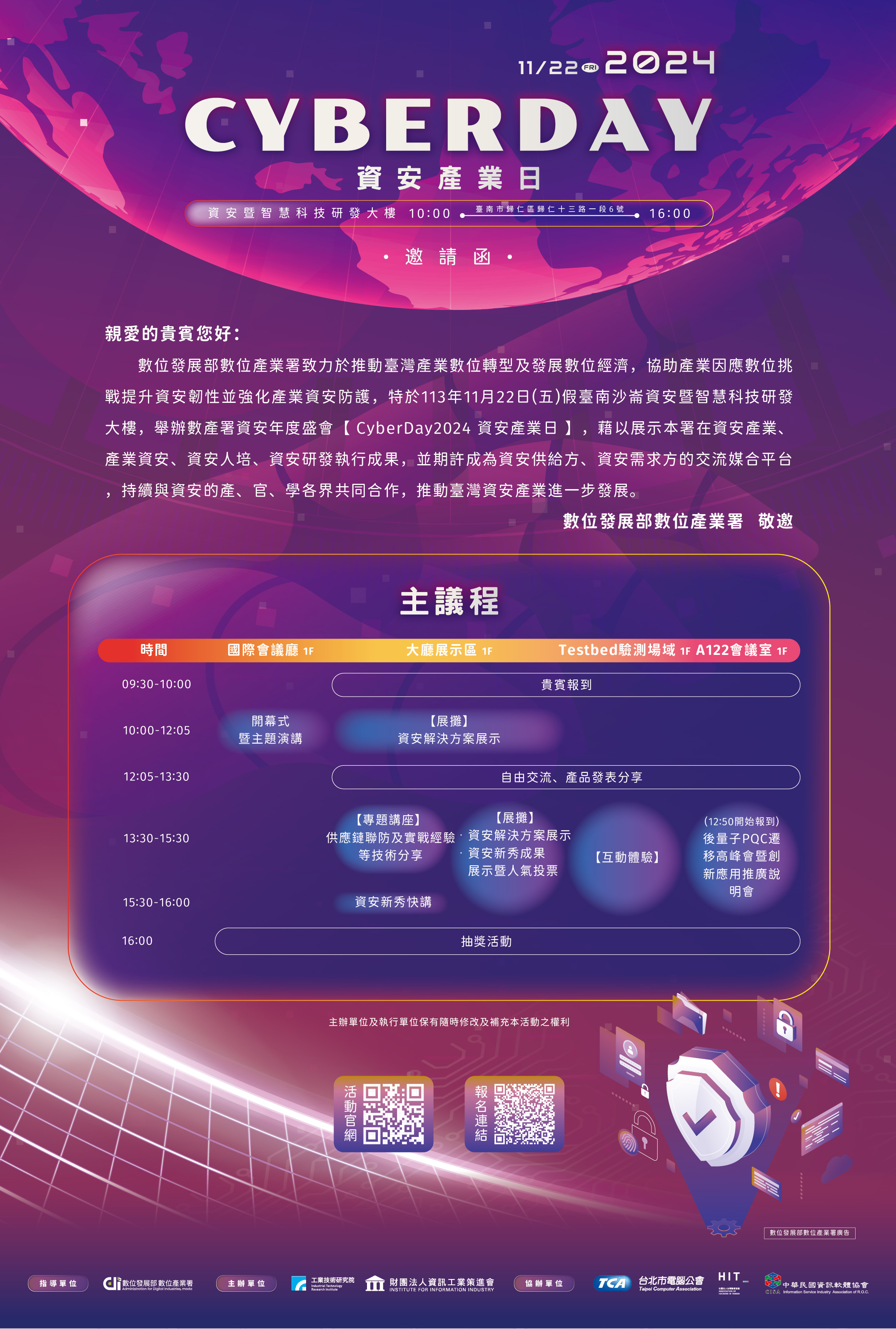 二、本計畫資安新秀成果展,將於數位產業署的資安年度盛會 「CyberDay2024資安產業日」活動中共同展示,活動訂於 11月22日星期五,假臺南沙崙國科會資安暨智慧科技研發大樓舉行。