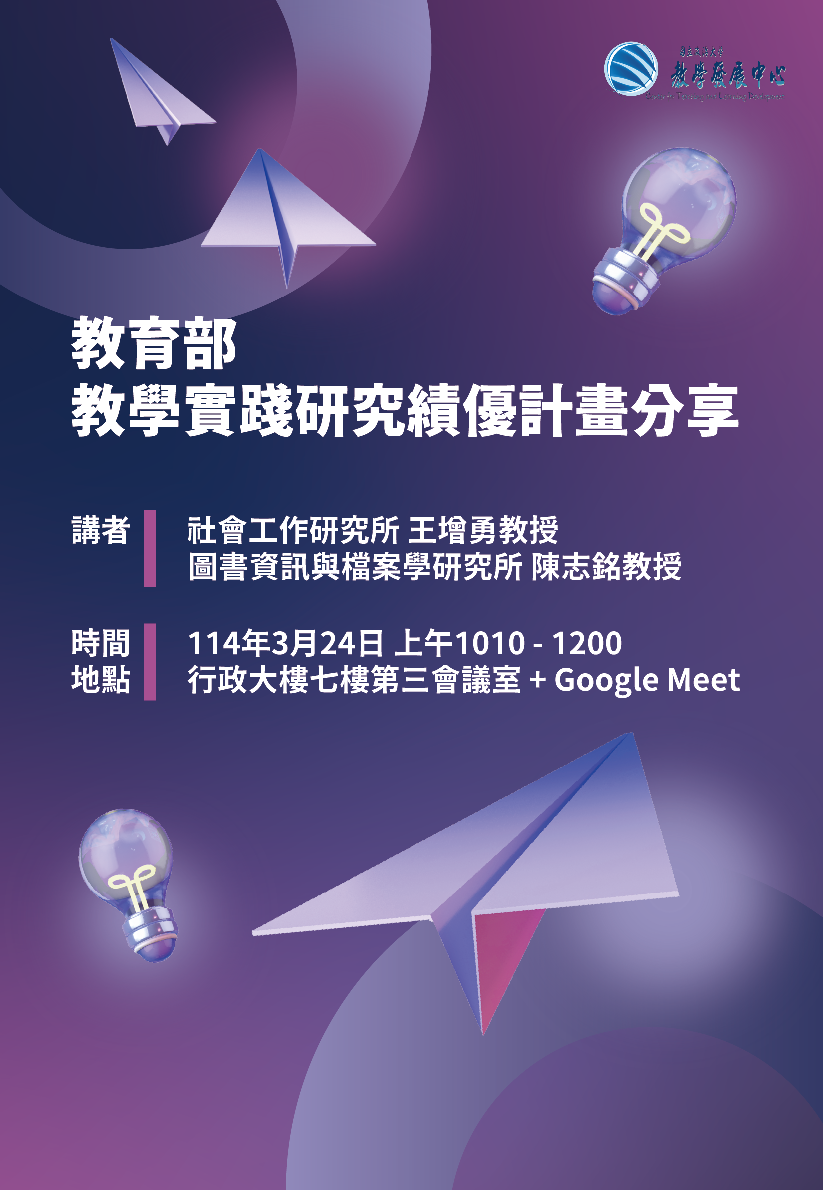 一、本校社會工作研究所王增勇教授及圖書資訊與檔案學研究所陳志銘教授獲得「112年度教育部補助大專校院教學實踐 研究績優計畫」,特邀請二位教師分享計畫申請、執行與教學成效。