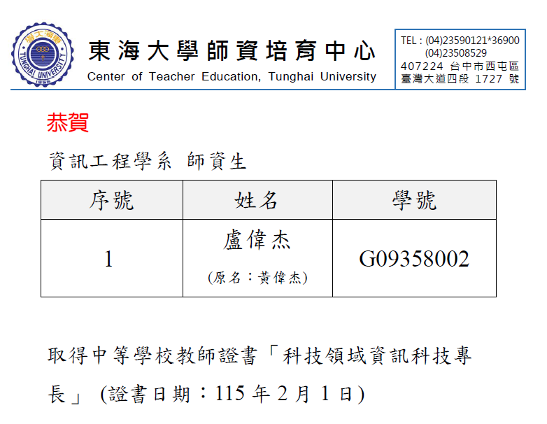 賀!本系盧偉杰同學取得中等學校教師證書