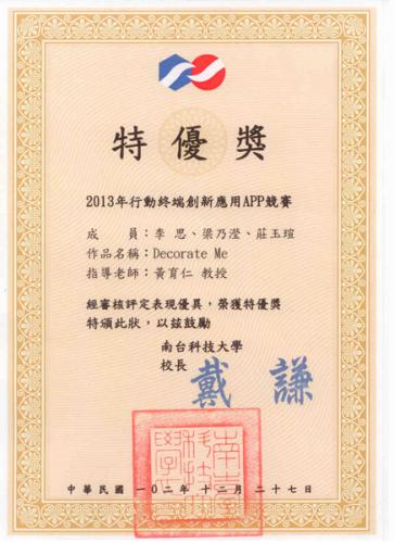 本校資訊工程學系參賽隊伍"思乃瑄",由指導老師黃育仁教授與大四李思、梁乃瀅、莊玉瑄同學組成,作品「Decorate Me」表現優異,備受評審委員肯定獲得2013行動終端創新應用App競賽特優獎(第一名)榮譽。