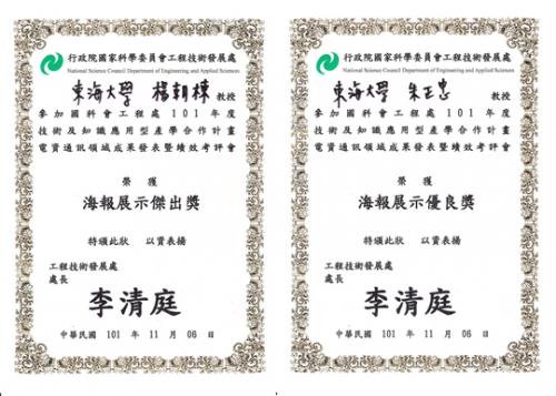 恭賀本系朱正忠教授及楊朝棟教授分別榮獲國科會工程處101年度技術及知識應用型產學合作計畫電資通訊領域成果展海報展示優良獎及傑出獎